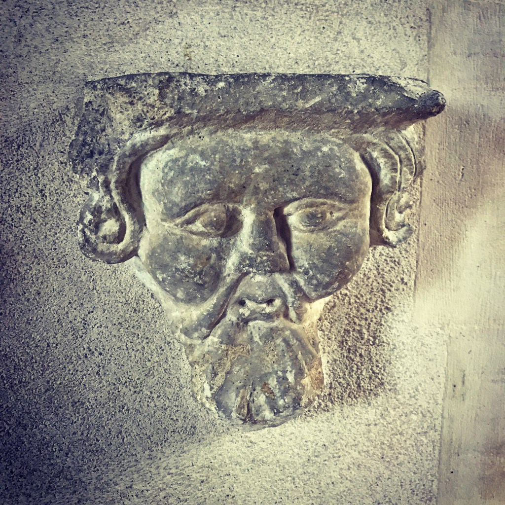 I visited Saxlingham church, and located the effigy of Lady Mirabel, and her Bible, and tried to imagine that extraordinary tomb shoehorned into its narrow chancel. Peering out at me was an enigmatic medieval corbel, which Sir Christopher must surely have known very well. I looked at some stones in the churchyard, including the one shown at the start of this note. There were old yews huddled about, but these were far too young to have loomed over Sir Christopher.
