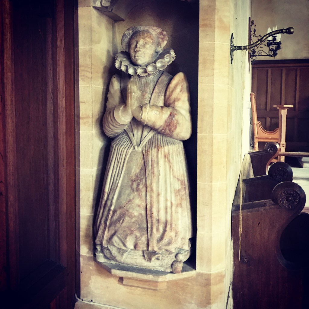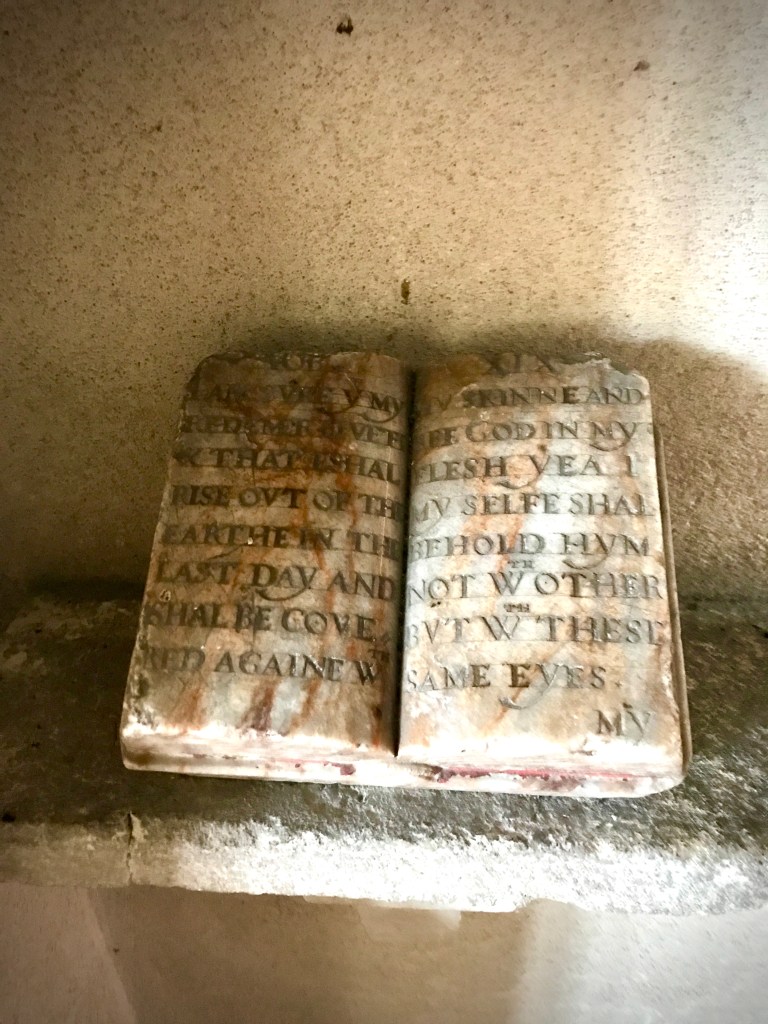 Heydon and his second wife were buried in Baconsthorpe church. As far as I can discover, his tomb is no longer extant — unlike that of his father, whom he disliked. The spectacular tomb of his first wife, Lady Mirabel Heydon, was judged in 1789 to have become unsafe, although that may simply have been an excuse to get rid of something by that time unfashionable, and was also demolished. Only two fragments of it remain — the effigy of Lady Mirabel herself, kneeling at prayer, and her open Bible.
