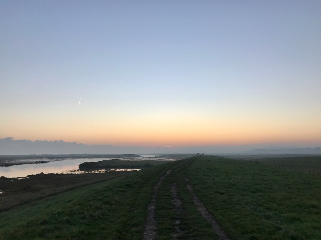 I looked out towards the marsh — easy to do, as the huge windows meant that the room in which we stood was totally exposed to the grave, wind-swept, somehow sullen vastness beyond. Dusk was falling. Far out on the horizon, a container ship was passing, hauling its anonymous burden from Rotterdam to points further north. “All that trade — I love it!” proclaimed Katy, loyally. She was more silent about the wind farm.